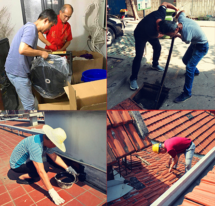 高温酷暑不止会给人的身体带来不适,对于老旧房屋也会造成隐患,7月17日上午,室外气温36度,暴晒下的屋面平顶,热浪扑面而来。身为房屋“维保医生”的房产集团一分公司维修班师傅们蹲在滚烫的屋面上进行治漏工作。房产集团各单位的工人们在社区疏通作业、在机房检修设备、在社区清扫、在胜利街优保建筑进行立面修缮、在工地周围进行围挡整理及道路清理......