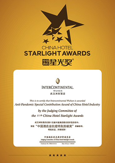 2020亚洲酒店及旅游论坛暨第十四届中国酒店星光奖评选,于2020年8月12日-14日在上海举行,武汉洲际酒店荣获中国酒店星光奖――中国酒店业抗疫特别贡献奖。