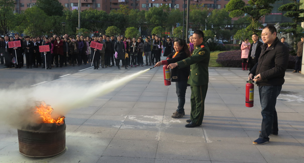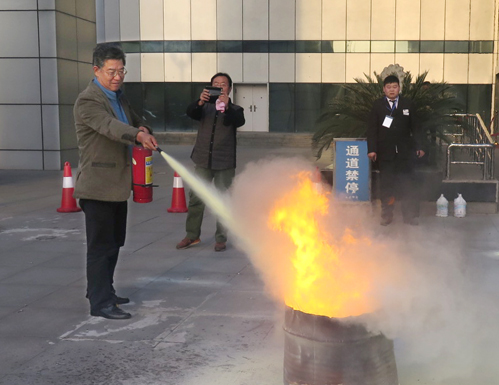 演练活动邀请了武汉市消防支队特勤中队作全程技术指导。具有丰富实战经验的消防员为大家讲授消防安全基本常识,演示室内消防栓和灭火器的使用方法,讲解了气垫逃生要领。16点整,消防警报骤然响起,应急广播随即启动,办公楼大厅和楼道内浓烟四起,办公大楼全体工作人员及办事人员按照疏散逃生要领,分别从大楼东、西两侧紧急通道迅速疏散。所有人员仅用时8分钟就全部撤离至指定的疏散集结点。随后,参演人员按照动作要领,分别实际操练了消防水带连接、油盆灭火等消防技能。