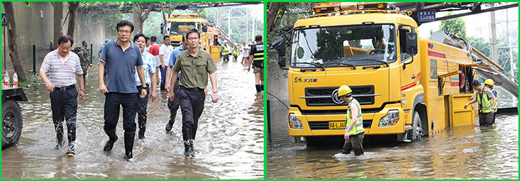 7月7日上午,在接到集团公司指令后,水务集团长江隧道公司立即将在武昌区域排渍接近尾声的大型抽排设备“龙吸水”派往青山区21号公路渍水段。中午近13时到达现场后,集团公司总经理李兵及总经理助理陈春保立即向小分队布置了抢排工作任务,勉励大家发扬不怕苦不怕累的硬骨头精神,继续奋战,为保卫市民的财产安全和城市安全再作贡献。桥建集团抢险小分队与“龙吸水”小分队进行了对接,一起踏水进行实地勘察后,安排10多名队员各就各位。这些队员在其他地点排渍,连早饭都没顾得上吃,但是个个仍然精神抖擞,有条不紊地开始忙碌起来。