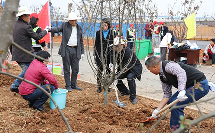 在植树现场,公司领导吴文、江强生、余靖玲、朱斌、盛华、陈春保、王贤兵与大家一起挥锹铲土,提水浇灌。全体同志兴致勃勃,干劲十足......