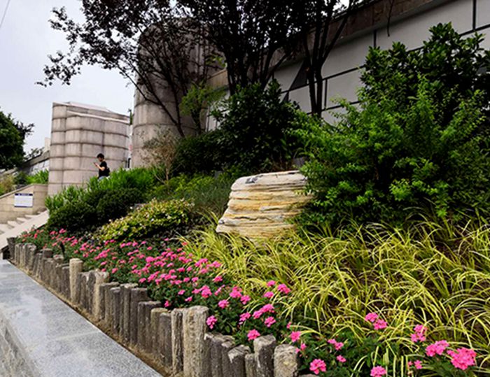 在永清门闸口处,植物特色为“竹隐青松”,以竹子、罗汉松等常绿木本多年生植物为主,营造出绿意盎然的葱戎景象,整体呼应“永青”二字。