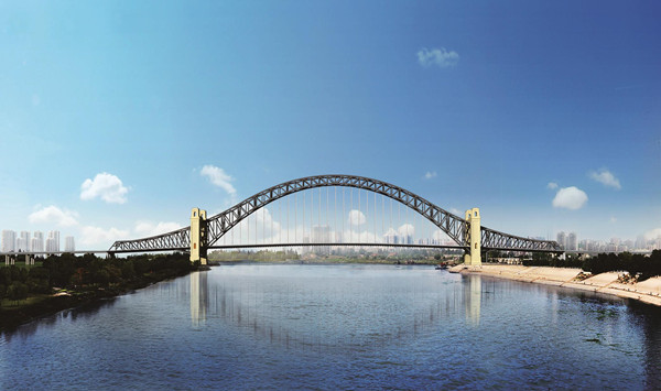 江汉七桥为钢桁拱桥,跨域汉阳、?口两个行政区,是武汉市第七座跨汉江通道。大桥距下游知音桥1.2千米,距上游古田桥2.6千米,全长约2.7公里,主桥长672米。主跨长408米,为国内同类桥梁第二。大桥预留双向8车道空间,桥面宽达52.5米,是汉江上最宽的大桥。大桥建成后,将有效减轻二环线过汉江交通压力,将武汉?口、江汉、东西湖、汉阳和沌口五个城区工业园区域进一步有机连接起来,促进汉口汉阳一体化发展。