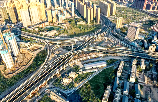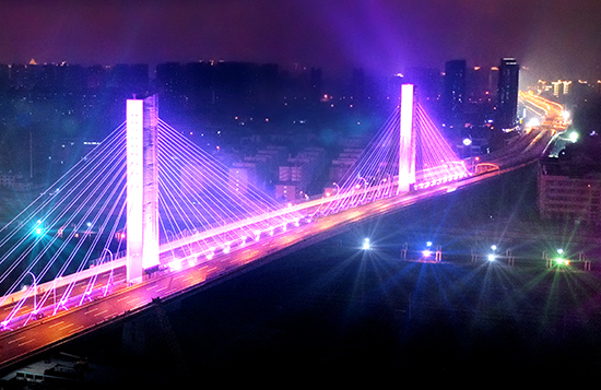 杨泗港快速通道青菱段工程项目施工难度大,管线迁改复杂,溶洞区桩基施工困难,立交区域交通疏解及施工组织难度大。其中跨铁路斜拉桥是该工程最关键的控制性节点工程,桥梁上跨多条铁路既有线路,跨铁路线范围长达200多米,主桥桥墩与铁路线最近距离仅22米。9号墩转体时还跨越了武昌首义学院校区,施工安全风险高、技术难度大。为加快推工程建设,项目采取了钢箱梁斜拉桥转体施工法,即先在平行于铁路的方向进行钢箱梁拼装及主塔施工,再利用铁路营业线“天窗点”要点进行转体施工。在转体过程中,项目采用了“转体球铰”的转动装置黑科技在夹缝中施工,克服了桥梁转体重量大、转动角度大、转体精度控制高、转体梁悬臂长、桥型结构特殊等困难,成功实现了斜拉桥的跨铁路转体,创造了目前世界上同类型跨度最大、桥面最宽、首座半漂浮体系独柱塔钢箱梁的斜拉桥转体记录。